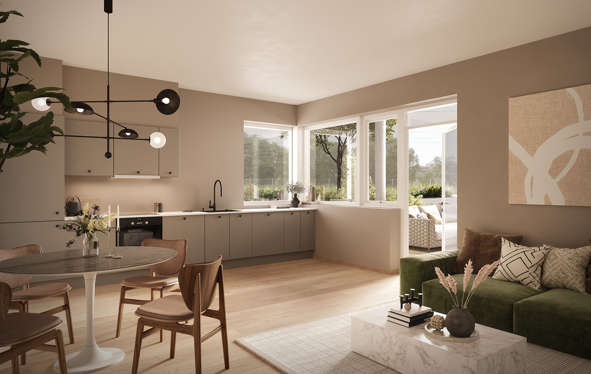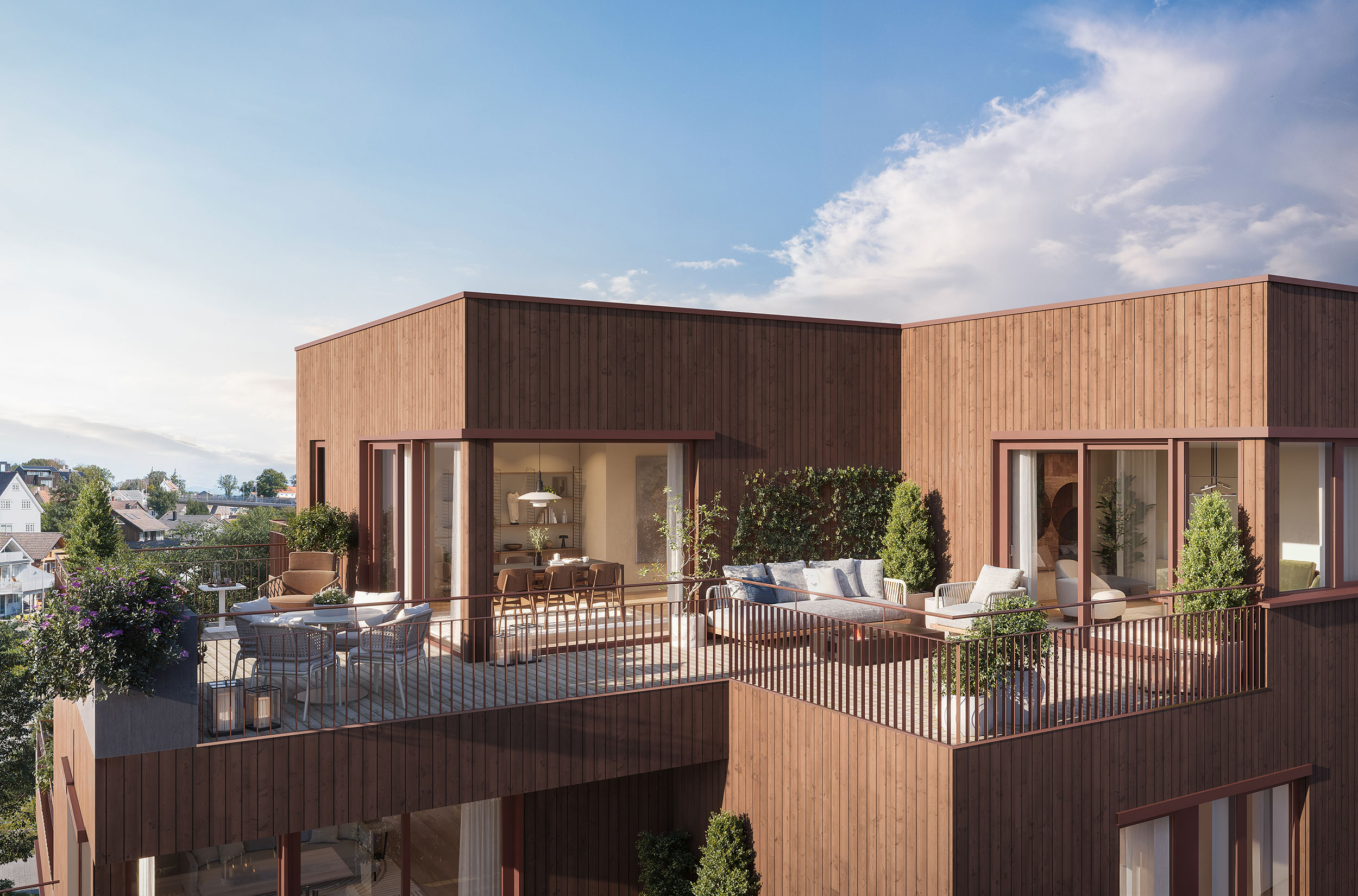 Alle 3D-illustrasjoner, perspektiver, tegninger og foto er kun ment å gi inntrykk av en ferdig bebyggelse og utendørsareal, og er ikke bindende for endelig utforming. Det kan inneholde elementer som ikke inngår i utbyggers leveranse, både når det gjelder utvendige forhold og innredning. All informasjon er derfor gitt med forbehold om rett for utbygger til å foreta endringer.