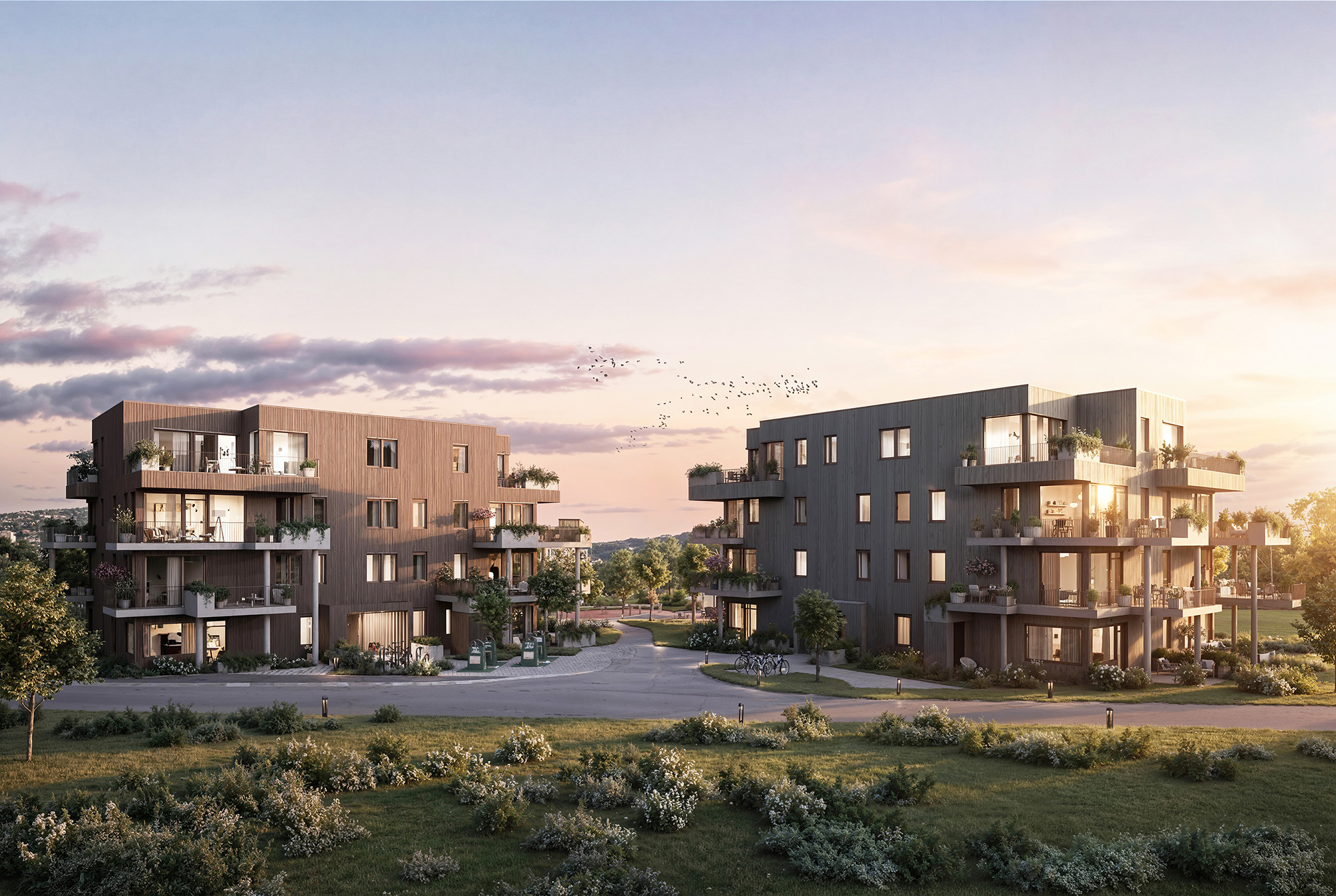 Det etableres et flott grøntområde med beplantning mellom byggene.