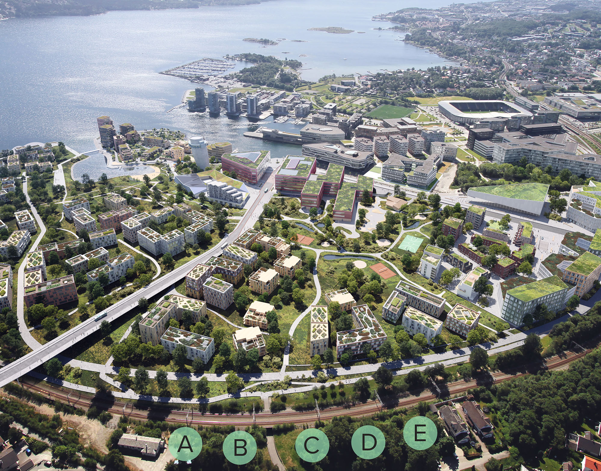 Bygg D og E ligger lekkert til mot det nye parkområdet som kommer i enden av Hinnavågen.